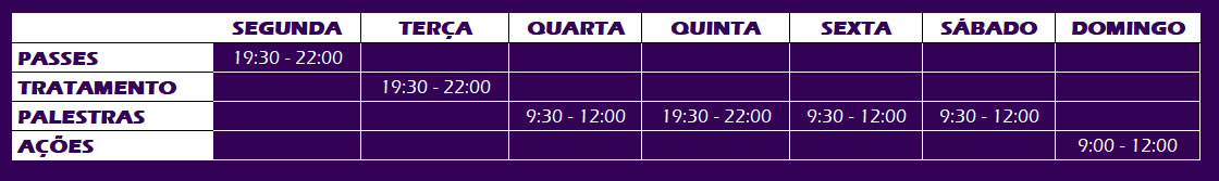 Além dos atendimentos fraternos e passes, também oferecemos outras atividades para o público, como palestras, estudos e trabalhos assistenciais. Essas atividades também costumam estar presentes na agenda do Centro, com datas e horários pré-determinados para cada uma delas.